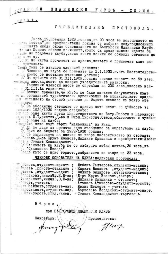 Деветнадесети ноември 1929 година открива нова страница в живота на туристическото движение в България. На тази дата 18 ентусиазирани планинари, възпитани и израсли в Българското туристическо дружество (БТД) и Юношеския туристически съюз (ЮТС), слагат началото на нова организационна форма – Българския планински клуб (БПК) .